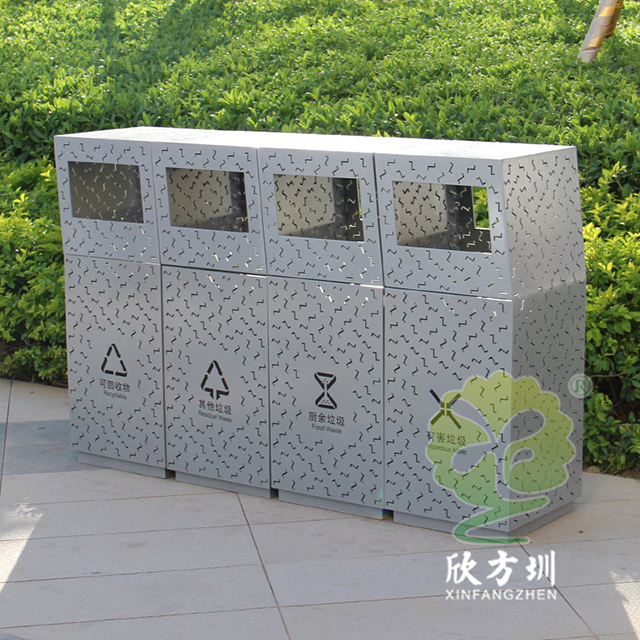 戶外鏤空組合式分類不銹鋼垃圾桶采用了201#不銹鋼板制造而成,產(chǎn)品型號(hào):C1089-A,尺寸規(guī)格:260*260*900mm,戶外方形組合式四分類方形抽象設(shè)計(jì),桶身前后左右整體采用Z形鏤空有效散發(fā)桶內(nèi)異味,正面鏤空國(guó)家最新的分類標(biāo)識(shí),背后三角鑰匙可以取出內(nèi)置的鍍鋅板內(nèi)筒,這款垃圾桶是廣東深圳前海合作區(qū)定制的,還定制了鏤空Z(yǔ)字鏤空的休閑椅配套使用。