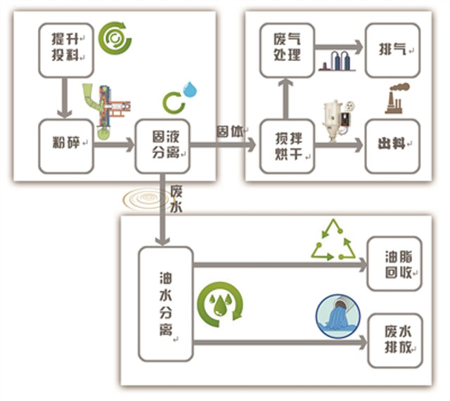 “我們學校丁蘭校區一共有師生1800余人,早中晚三餐,每天餐廚垃圾量非常大。”他說,2016年學校引進了一套設備,還專門為它建了一個垃圾房,裝了一個通道連接樓上的食堂餐廳。設備集粉碎脫水機、干燥處理系統、油水分離器、除臭系統以及投料裝置、物料輸送裝置于一體,直接源頭就地快速處理每天的餐廚有機垃圾,杜絕二次污染,做到資源回收綜合利用。