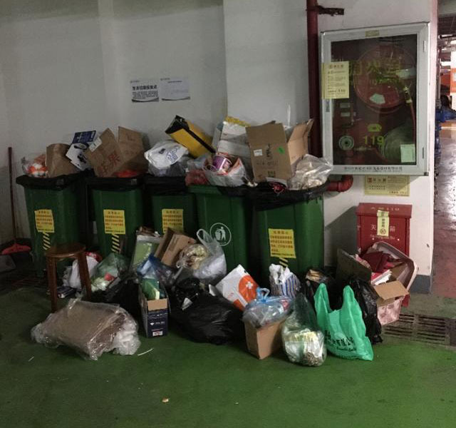 紅山片區(qū)某小區(qū)居民徐先生稱,從12月15日起,“每棟樓只剩下地下停車場(chǎng)放了幾個(gè)垃圾桶,非常不方便,業(yè)主不滿就把垃圾到處扔”,有的業(yè)主還把垃圾扔到了物業(yè)管理處門口,以表達(dá)投訴。