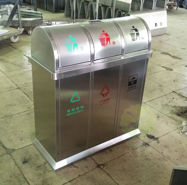 戶外不銹鋼三分類垃圾桶:搖蓋款式,密封性好,防止垃圾臭味傳出,也可以防止蛇蟲鼠蟻滋生。適用于街道、工廠、公園、廣場、學校等人流量大的戶外場所,生產周期10-15天。