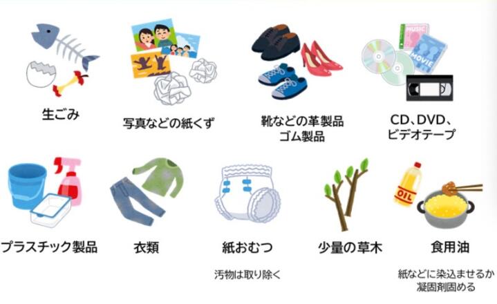 可燃垃圾有料理時產生的垃圾,照片紙屑,鞋子的橡膠制品的垃圾,CD磁帶等垃圾,塑料制品的垃圾,衣類垃圾,毛巾紙類垃圾,被食用油沾染的垃圾。