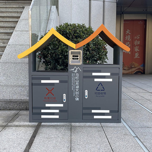 其廣泛的適用性使其成為各類戶外場所的理想選擇。在公園中,它可以放置在各個景點和休息區域,引導游客進行垃圾分類,保護公園的自然環境;在住宅小區,它能擺放在每棟樓的入口處,方便居民分類投放垃圾,提升小區的整體環境品質;在學校校園內,能培養學生的環保意識,讓垃圾分類從小抓起。總之,這款戶外屋形鍍鋅板分類垃圾桶,憑借其獨特的設計和實用的功能,能夠在各種戶外場景中發揮重要作用,助力環保行動的深入開展。
