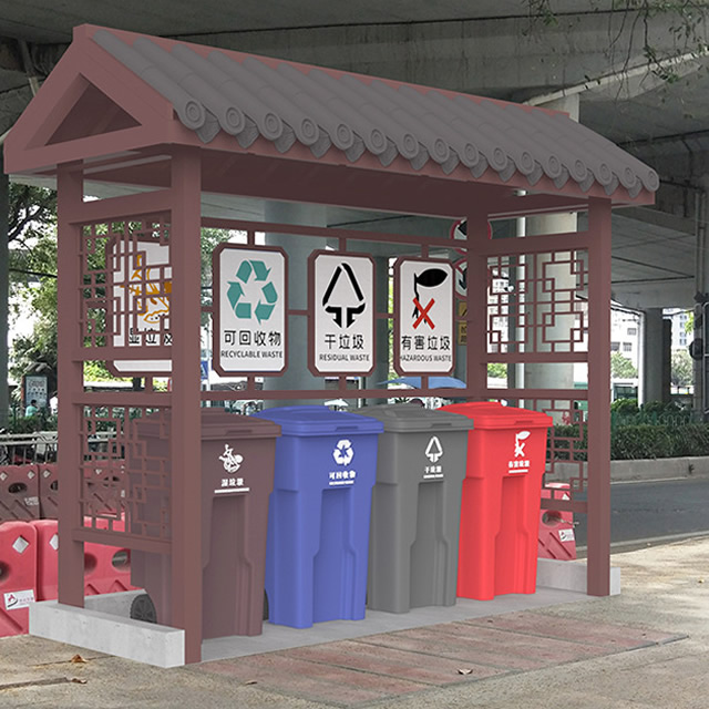 目前,戶外四分類資源回收垃圾房是城市生活垃圾處置的主流趨勢,也是現代城市文明進步的標志之一,有利于提升垃圾清運效率,便于再生資源的回收利用,減少環境污染,緩解環衛工人常規保潔的壓力。垃圾分類亭,分為地基基礎設施、公益宣傳欄、立柱、頂棚等,亭內設置可回收、有害垃圾、廚房垃圾和其他垃圾等垃圾桶,垃圾桶及宣傳欄配有垃圾分類的宣傳標語,廣大群眾可以根據垃圾桶的提示標語,將廢棄的生活垃圾投放到對應的垃圾桶中。