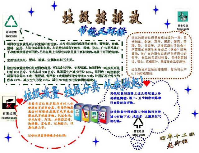 ? ? 我國是世界垃圾最大生產(chǎn)國,但是垃圾處理效果卻落后于大部分國家。對于垃圾來說,無論哪種處理方式都會對環(huán)境產(chǎn)生危害,增加社會負(fù)擔(dān),造成資源浪費(fèi)。所以解決垃圾處理問題的最好辦法就是,改變生活方式,減少垃圾制造。于此,垃圾分類宣傳必不可少,以下是學(xué)生常用的環(huán)保垃圾分類手抄報(bào),可以幫助學(xué)生理解生活垃圾分類的知識與現(xiàn)狀。