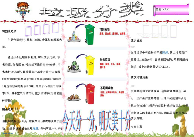 為什么要實行垃圾分類呢?因為我國每人每年平均產生300公斤垃圾;許多城市都面臨垃圾圍城的局面;而生活垃圾被認為是最具開發潛力的、永不枯竭的“城市礦藏”,是“放錯地方的資源”;垃圾分類后被送到工廠而不是填埋場,既可以減少占地,降低垃圾處理成本,又避免了填埋或焚燒所產生的環境污染,還可以變廢為寶;垃圾分類收集是垃圾資源化利用的前提和基礎,是發展循環經濟的突破口,具有社會、經濟、生態三方面的效益。以下生活垃圾分類手抄報有分類垃圾桶網收集整理,請勿作商業用途。