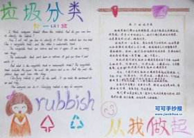 我們每個人一天雖只制造出一公斤左右的量,但是整個地區(qū)加起來,所產(chǎn)生的垃圾量的總和就相當大。因此,解決垃圾問題,首先就是以垃圾減量開始,然后做到分類回收,最后才是處理。我們平時所說的“垃圾減量”,實際上有兩層含義:1.減少個人垃圾的生產(chǎn)量:2.拓展垃圾用途,廢物利用,使垃圾不成為垃圾;垃圾分類精美手抄報有分類垃圾桶網(wǎng)收集整理。