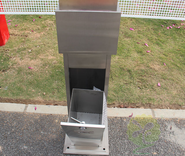 C630戶外立地式吸煙柱采用優(yōu)質(zhì)不銹鋼剪切、組裝、焊接、絲印而成,它包括外套管、支座、內(nèi)套管、煙灰盒、底座。外套管的底端固定連接在支座上,外套管的側(cè)壁上設(shè)有煙蒂置入口,內(nèi)套管用于集中收納從外套管的煙蒂置入口投入的煙蒂,內(nèi)套管設(shè)在外套管的內(nèi)管腔中,內(nèi)內(nèi)套管的開口端朝上,煙蒂置入口與內(nèi)套管的開口相連通,以使得從煙蒂置入口投入的煙蒂可從內(nèi)套管的開口端落入到內(nèi)套管的內(nèi)管腔中。