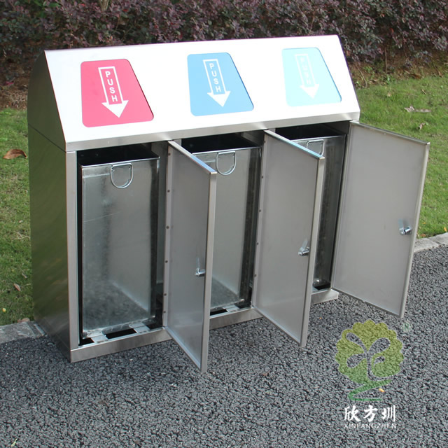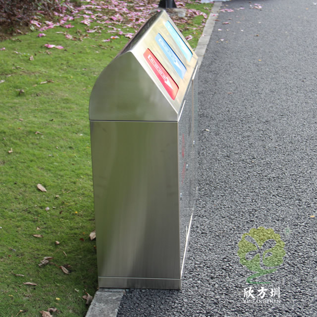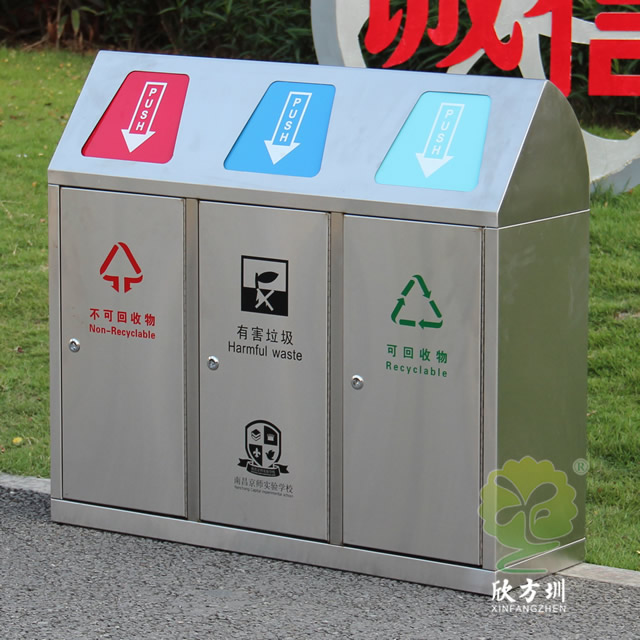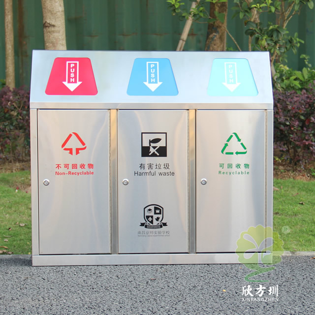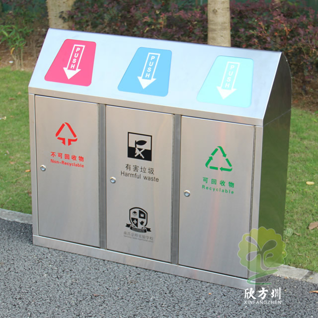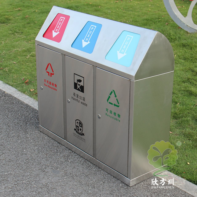 戶外學校帶蓋三分類不銹鋼垃圾桶采用201#,202#,304#優質不銹鋼材料模壓成型,堅固耐用,不易破損;耐火安全,抗高低溫,適合各種惡劣氣候條件;金屬亮澤,高雅美觀,廣泛適用于各種機場、商場高檔場所;內外表面光潔,減少垃圾殘留,易于清潔;配置鍍鋅板內桶,便于垃圾清倒;激光切割開料,尺寸精準,投口無縫焊接成型,打磨拋光處理圓滑不割手,欣方圳不銹鋼分類垃圾桶制作師傅有著多年經驗的熟手,每一道環節工藝成熟,質量可靠,確保客戶如期交付驗收。