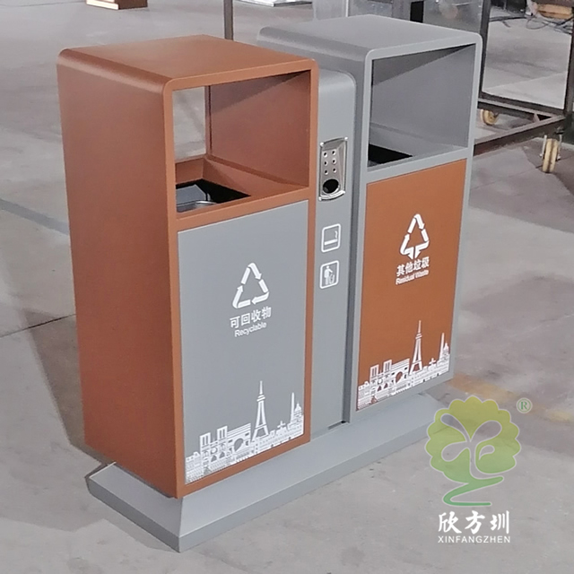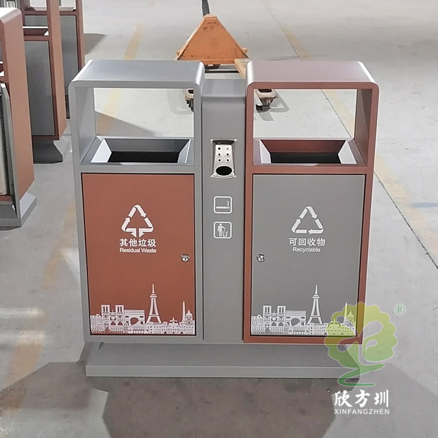 戶外城市道路不銹鋼分類垃圾箱采用了201不銹鋼板制造而成,如果客戶想減少成本可以選擇鍍鋅板或冷軋鋼板制作,圖片上的這兩款都差不多只是底座不一樣,這款垃圾桶是很常規的一個款式,正反面絲印了最新的國標分類標識,噴塑米白色、和黃色以及巧克力色,城市圖案采用了絲網印刷,上面雙面中心位置帶滅煙盒,噴塑可以打樣做色板。
