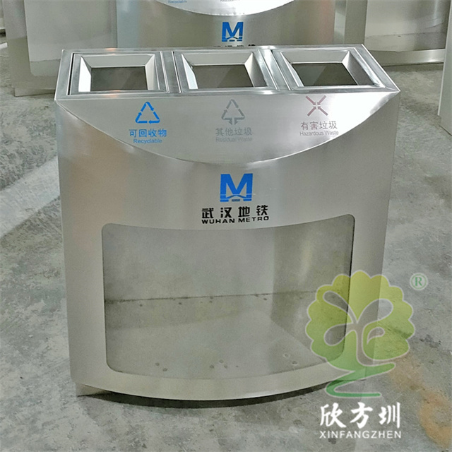 武漢地鐵站室內(nèi)透明三分類不銹鋼垃圾桶采用了優(yōu)質(zhì)的201不銹鋼1.0mm厚的板材制造,透明部分采用了3.0mm厚的亞克力板,三分類方形設(shè)計(jì),這款垃圾桶不含內(nèi)筒,直接套用透明塑料垃圾袋使用,絲網(wǎng)印刷了可回收物、其他垃圾、有害垃圾以及武漢地鐵logo標(biāo)識(shí)。