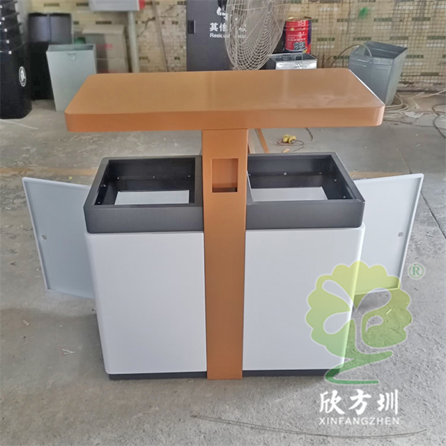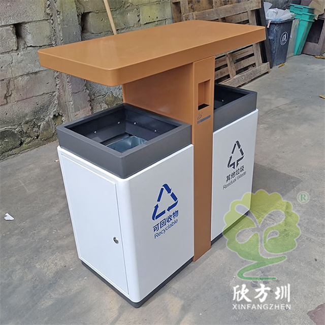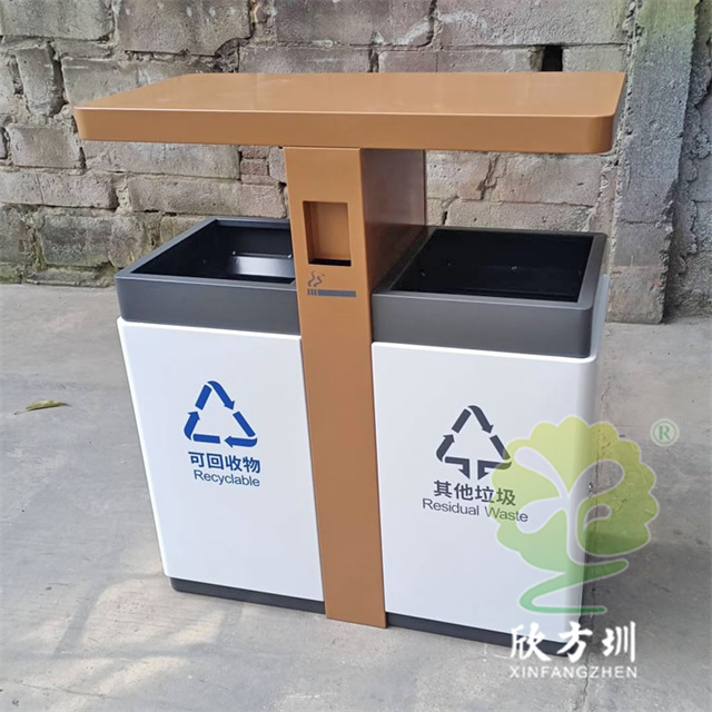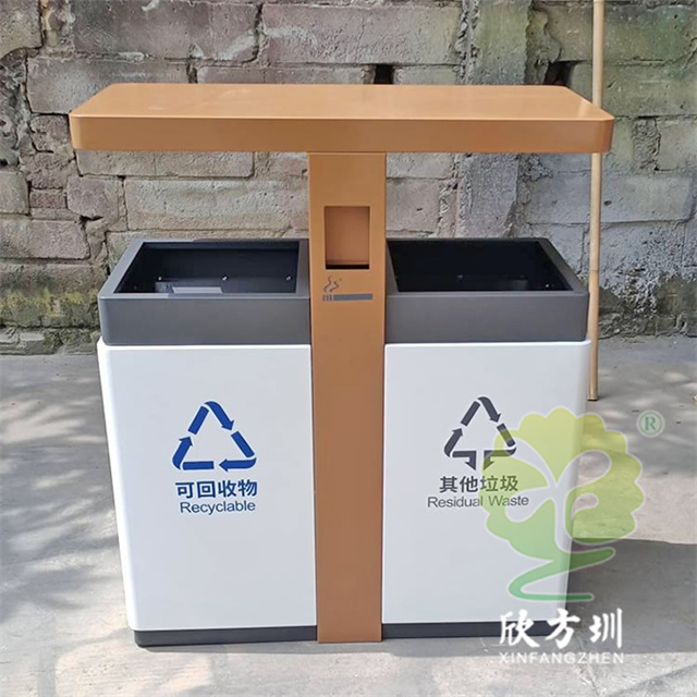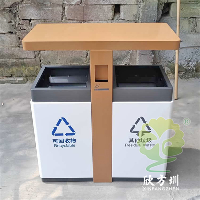 戶(hù)外噴塑雙開(kāi)門(mén)不銹鋼分類(lèi)垃圾桶外筒優(yōu)質(zhì)201不銹鋼1.0mm足0.92mm,采用了三色噴塑桶身白色、底部和投口灰色、立柱和擋雨棚黃色噴塑,側(cè)面三角鑰匙開(kāi)門(mén)可以取出內(nèi)筒,正面絲網(wǎng)印刷分類(lèi)標(biāo)識(shí),頂部雙面煙灰盅投口。