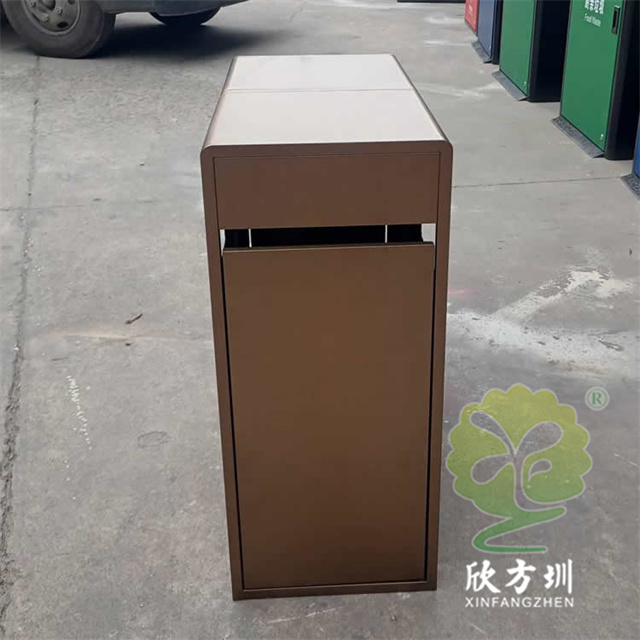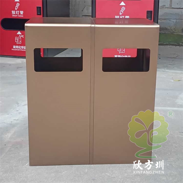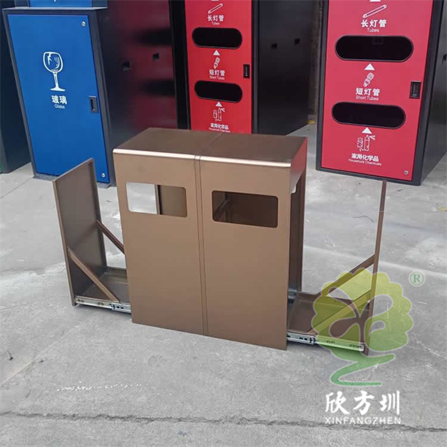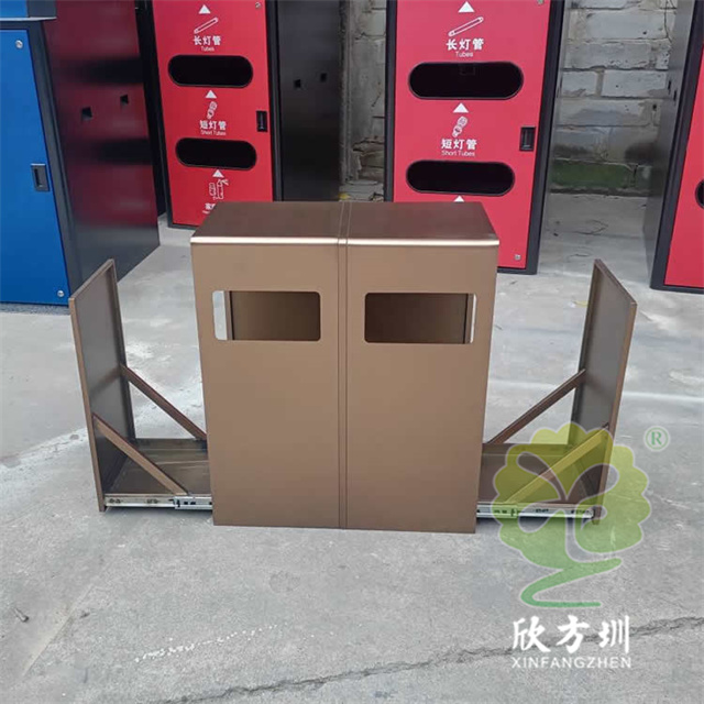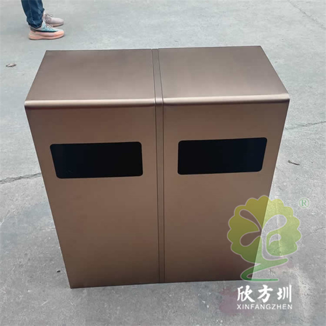 抽拉式滑軌電鍍防指紋不銹鋼分類垃圾桶采用了304不銹鋼1.5mm厚的板制作而成,側(cè)面兩連體分類抽拉式滑軌設(shè)計(jì),果皮箱金屬表面電鍍香檳金和做防指紋處理工藝,正反面可以油墨絲網(wǎng)印刷國(guó)標(biāo)分類標(biāo)識(shí)和企業(yè)logo,可以定制本色或者噴塑桶身。