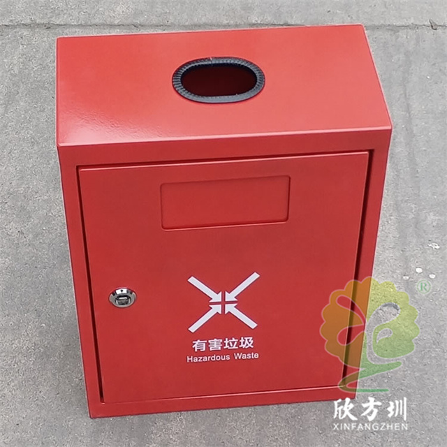 掛壁式噴粉烤漆方形不銹鋼有害垃圾箱采用0.8mm厚201不銹鋼板制造,也可以采用鍍鋅鐵板制作,方形掛壁式橢圓形直投口設計,金屬表面噴粉烤漆紅色上色,正面采用三角鑰匙可以取出內置的鍍鋅板內筒,投口帶膠墊防止投放時刮傷手掌。