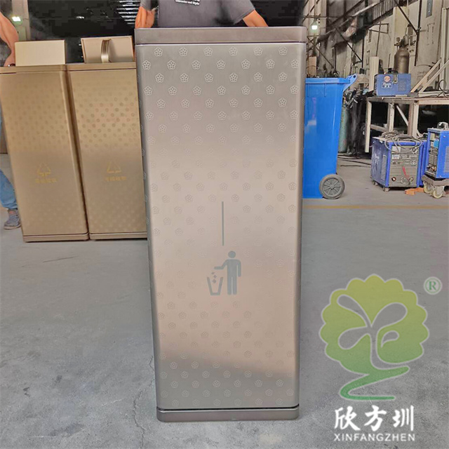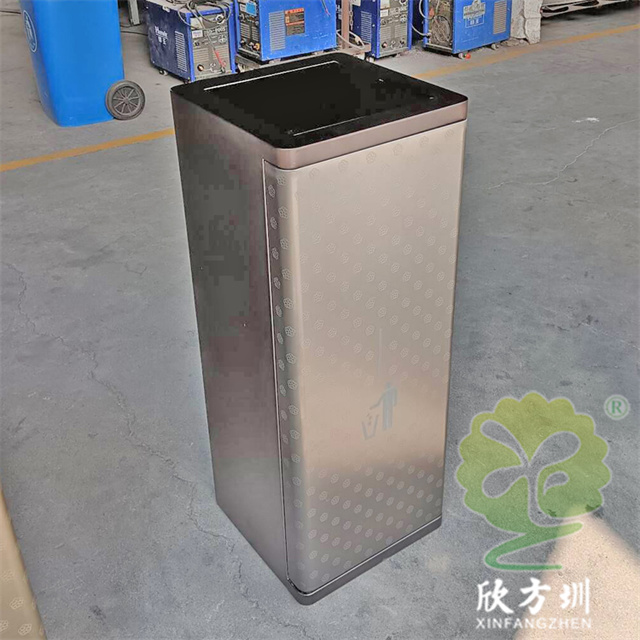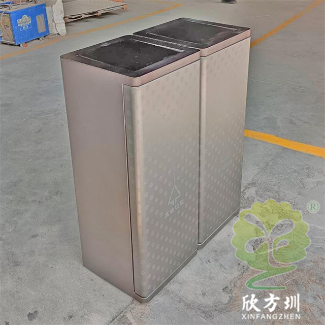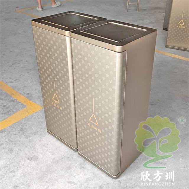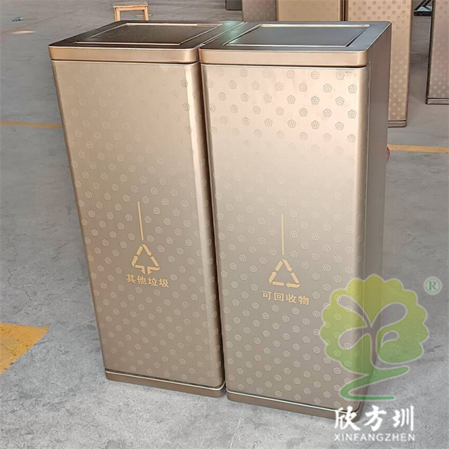 室內(nèi)電鍍腐刻不銹鋼分類垃圾桶單筒可以采用201/304不銹鋼板制造,兩個款式一款是單筒一款是兩分類方形帶搖擺蓋設計,雙筒用8*8mm方通相連,門板腐刻印花工藝,不銹鋼金屬表面做了電鍍黑鈦和香檳金工藝,正面抽拉式導軌抽可以取出內(nèi)膽,門板中心位置絲網(wǎng)印刷最新中英文國標分類標識或人頭標。