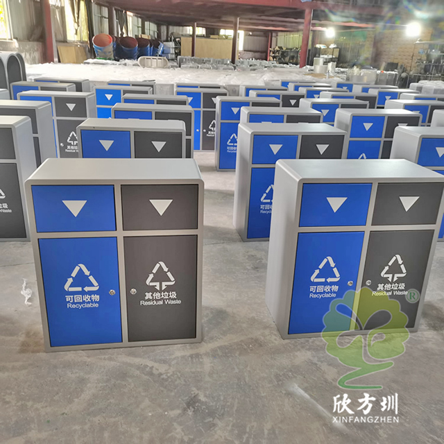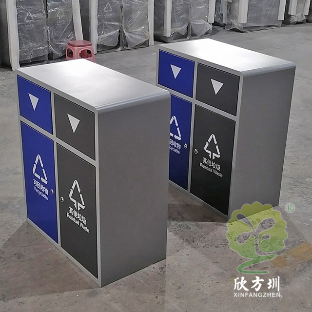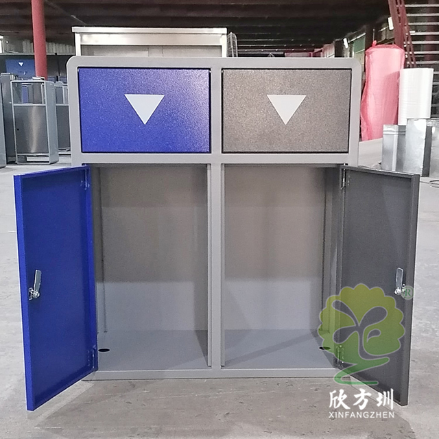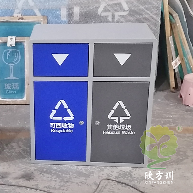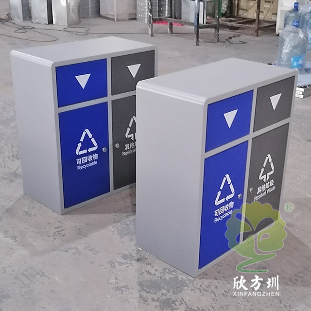 戶外搖蓋學校鋼板分類垃圾桶是采用優質的冷軋鋼板制作而成,有條件的客戶可以挑選201/304不銹鋼板做,方形搖晃蓋兩分類連體規劃,表面框架噴塑了米白色,可回收物門板和投口蓋子噴塑藍色,其他垃圾門板和搖晃蓋子噴塑了灰色,表面絲印最新國標分類標識,標識下方絲印了英文的翻譯,蓋子下方絲印三角形往下推的箭頭,欣方圳垃圾桶廠家支持定制,有需要可以聯絡咱們客服人員。
