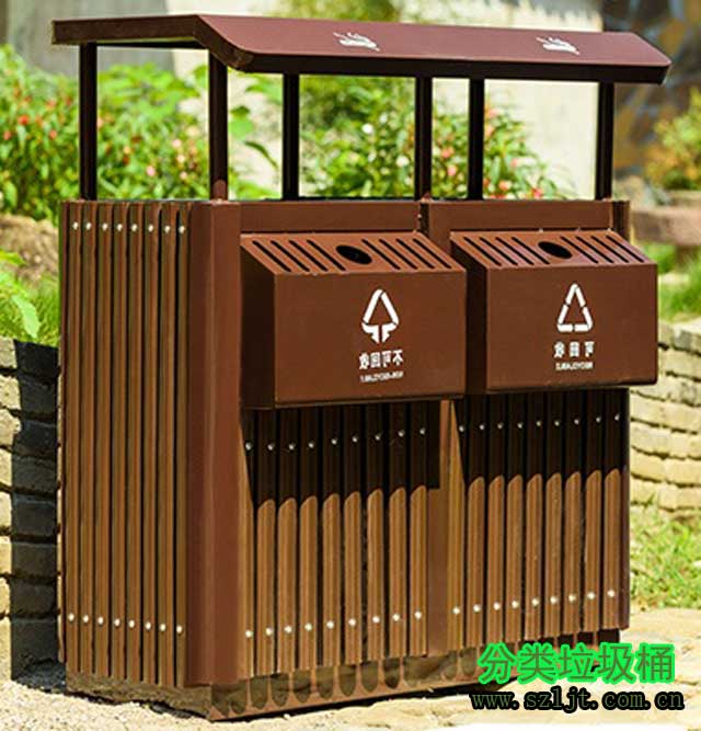 公園景區(qū)古典鋼木分類垃圾桶桶身采用優(yōu)質(zhì)進(jìn)口防腐木、進(jìn)口山樟木或水曲柳制作,可抑制生物、微生物的寄生、繁殖與侵蝕,延長木材在戶外環(huán)境中的使用壽命。表面經(jīng)過除蟲,防蟻,防腐,烘干等專業(yè)處理后加工成型,經(jīng)久耐用,防腐美觀。桶蓋/內(nèi)膽采用FRP玻璃鋼材料制造,具有防腐、防生銹、易清潔等特點(diǎn)。底座采用玻璃鋼纖維制作,從根本上解決了防腐、防盜、生銹的問題,產(chǎn)品在戶外的使用壽命大大增強(qiáng)。此款垃圾桶無論是從外觀,性能還是環(huán)保方面來講都十分優(yōu)越,尤其適合擺放在花園,公園,小區(qū),學(xué)校,街道,景區(qū),游樂園等場所,備受客戶青睞。