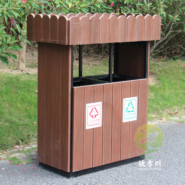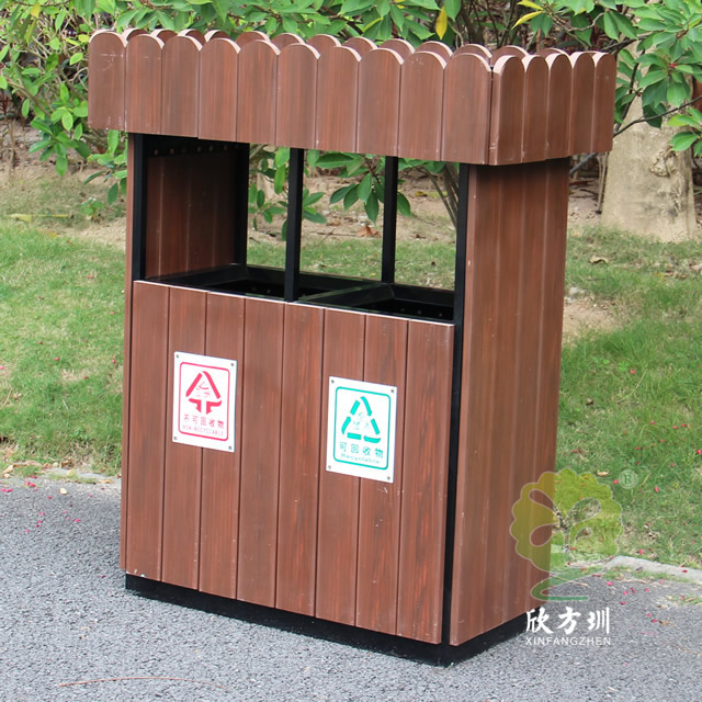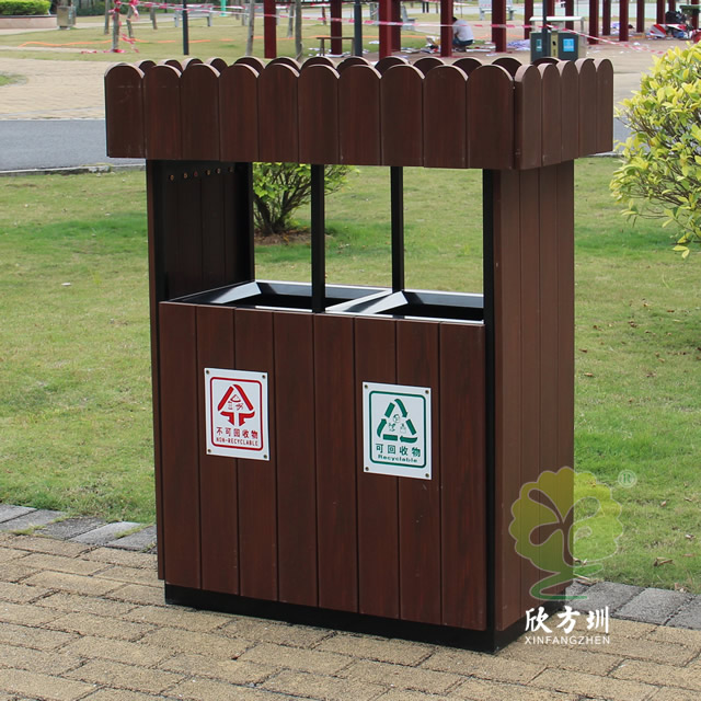 戶外防腐木帶花箱分類垃圾桶900*400*1060mm,G138,桶身采用優(yōu)質(zhì)進(jìn)口防腐木、進(jìn)口山樟木或水曲柳制作,可抑制生物、微生物的寄生、繁殖與侵蝕,延長木材在戶外環(huán)境中的使用壽命。表面經(jīng)過除蟲,防蟻,防腐,烘干等專業(yè)處理后加工成型,經(jīng)久耐用,防腐美觀。桶蓋/內(nèi)膽采用FRP玻璃鋼材料制造,具有防腐、防生銹、易清潔等特點(diǎn)。底座采用玻璃鋼纖維制作,從根本上解決了防腐、防盜、生銹的問題,產(chǎn)品在戶外的使用壽命大大增強(qiáng)。此款垃圾桶無論是從外觀,性能還是環(huán)保方面來講都十分優(yōu)越,尤其適合擺放在花園,公園,小區(qū),學(xué)校,街道,游樂園等場所,備受客戶青睞。